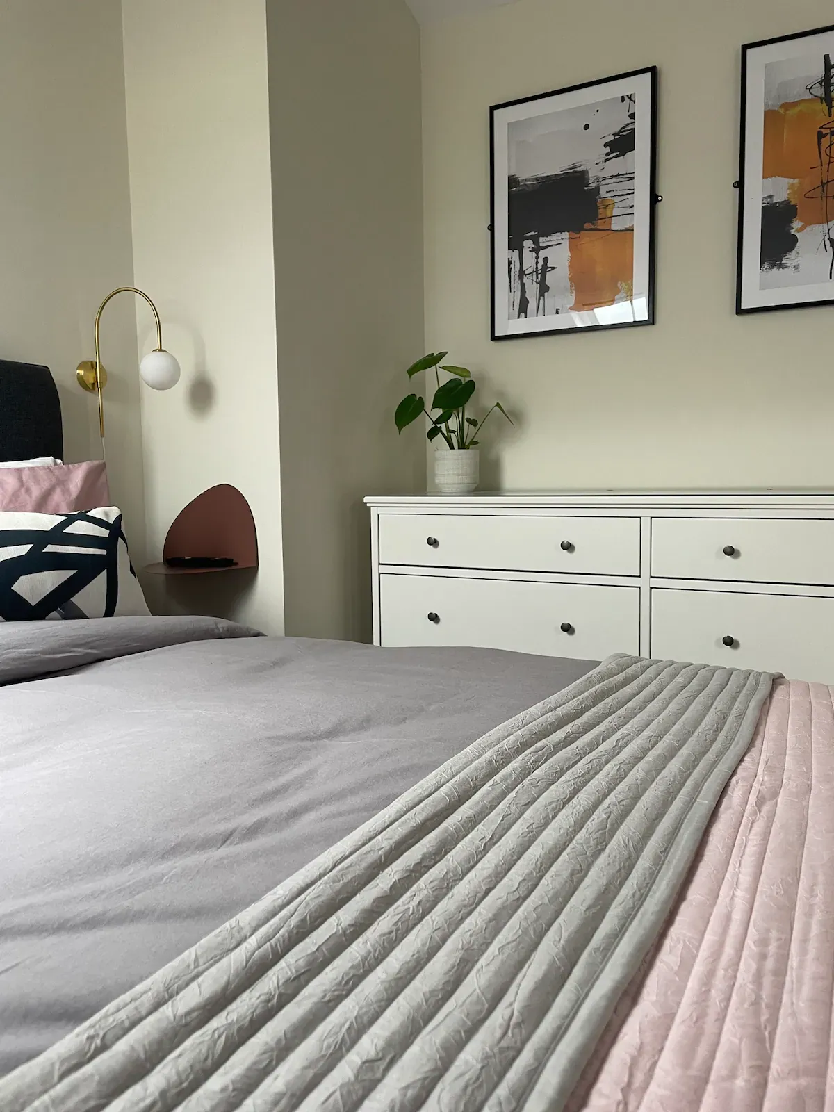 Bright and airy room with hotel quality king size bed, double chest of drawers and hanging rail.